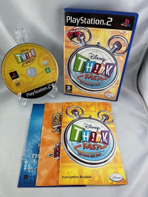 Disney Think Fast PlayStation 2-re megjelent, használt Disney partyjáték. Eredeti lemez, kisfüzet megléte a képek szerint. Gyors kérdések, vidám hangulat, családi szórakozás.
