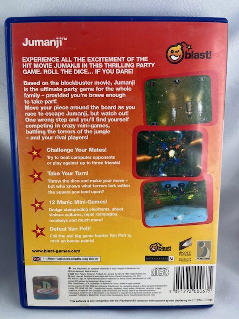 A Jumanji PlayStation 2-es változata a klasszikus film világát kelti életre, ahol a játékos veszélyes dzsungelekben, rejtélyes környezetekben és csapdákkal teli pályákon halad előre. A játék során különféle kihívásokat kell teljesíteni, ellenségekkel megküzdeni és ügyességi feladatokat megoldani, miközben a túlélés a legfontosabb cél. A kalandos hangulat és a változatos pályák izgalmas élményt nyújtanak fiatalabb játékosoknak és a film rajongóinak PlayStation 2 konzolon.