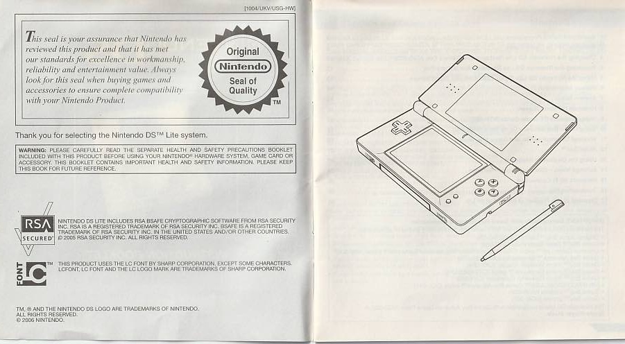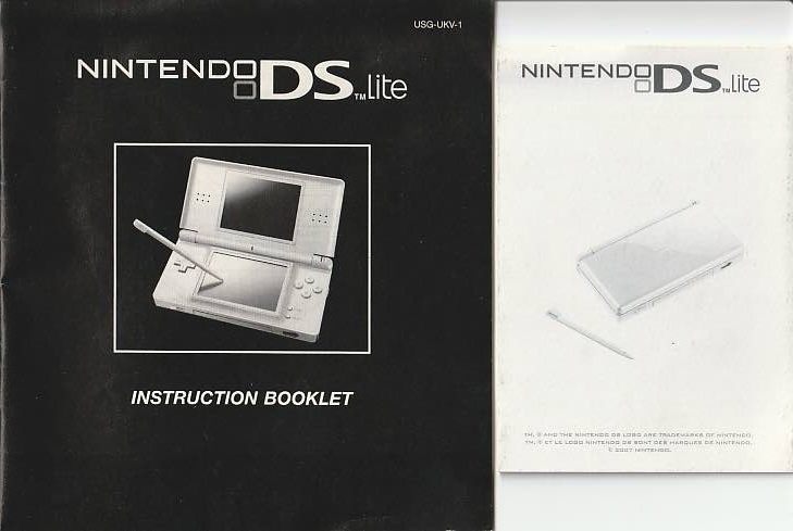 A Nintendo DS Lite az eredeti konzolhoz tartozó hivatalos kisfüzet és kiegészítő lap.