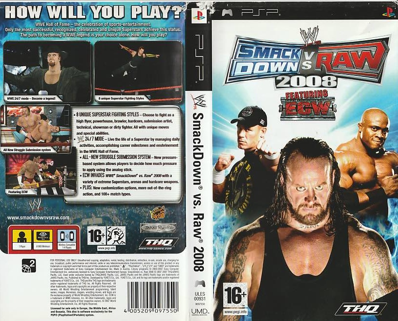 A PSP SmackDown vs. RAW 2008 borító az eredeti játékhoz tartozó hivatalos kiadás.