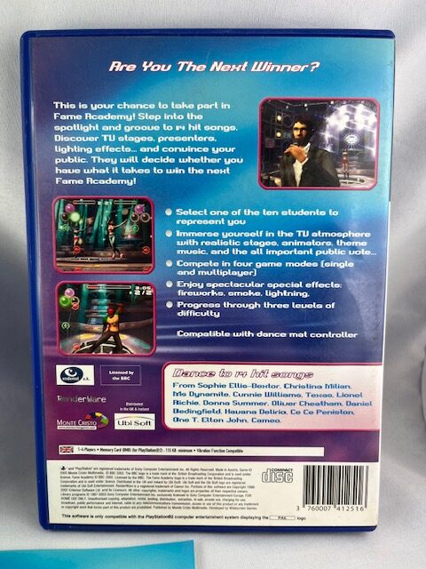 Fame Academy PlayStation 2-re megjelent, használt zenei/szimulációs játék. Eredeti lemez, kisfüzet megléte a képek szerint.
