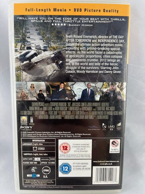 2012 látványos katasztrófafilm PSP UMD Video formátumban. Használt, eredeti tokos kiadás. Nem játék.